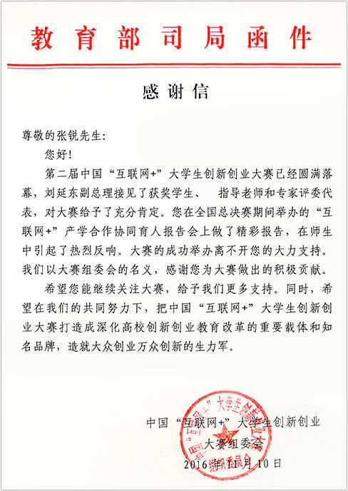 • 2018年,雷速连续多年为中国国际互联网+大学生创新创业大赛做出积极贡献,获教育部来函致谢。